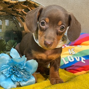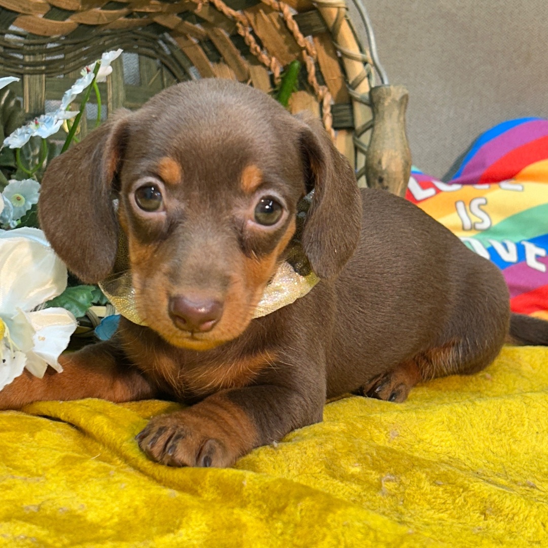 Hi, I’m Bree! I’m a 6-week-old female Dachshund with a beautiful chocolate & tan coat, born on June 14, which makes me a Gemini sign. I’ll be ready to go home to my forever family after August 10, once I’m grown enough to leave my litter. I’m AKC registered. I’m excited to bring a lot of love and a little bit of puppy chaos.