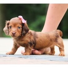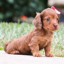 Hi, I’m Cleo! I’m a 9-week-old female Dachshund with a beautiful chocolate dapple coat, born on May 29, which makes me a Gemini sign. I’ll be ready to go home to my forever family after July 24, once I’m grown enough to leave my litter. I’m AKC registered. I’m looking forward to filling your days with joy and my playful antics.