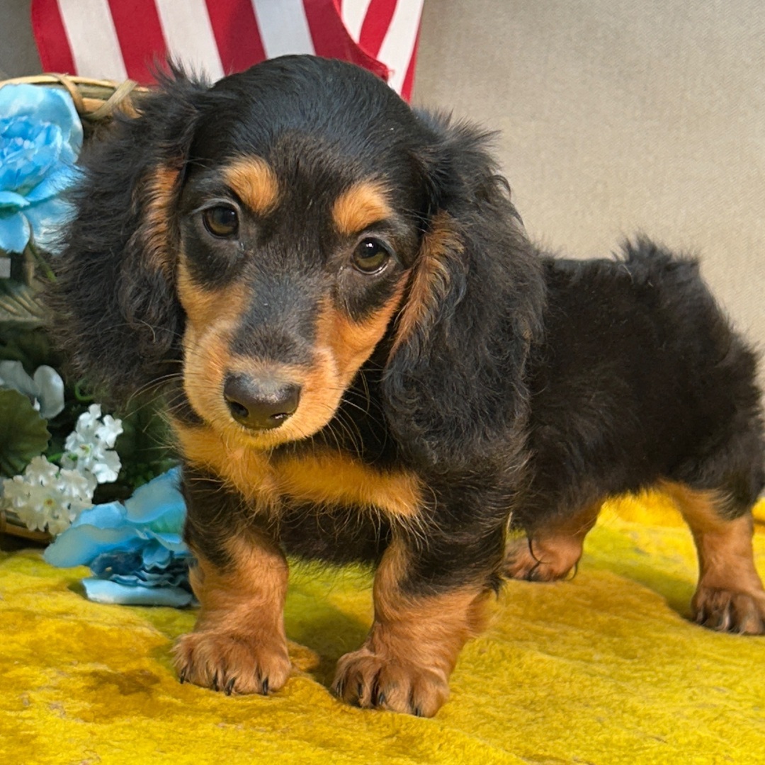 Hi, I’m Gordon! I’m a 10-week-old male Dachshund with a beautiful black & tan coat, born on May 20, which makes me a Taurus pup. I am ready now to plan my trip to my forever family. I’m AKC registered. I’m looking forward to all our future cuddles and adventures.